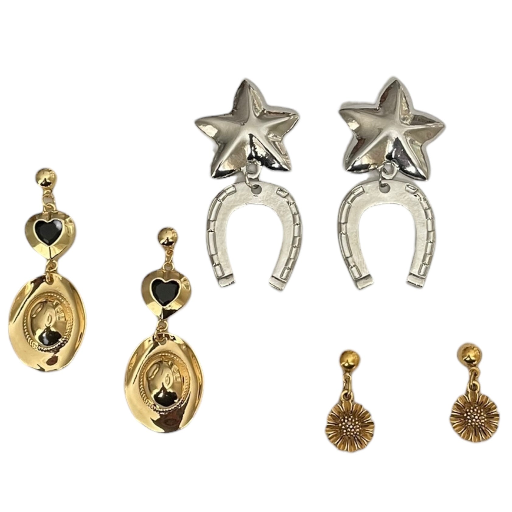 This three-pair gold-plated earring bundle draws inspiration from western and nature-influenced motifs. Ranging from subtle to statement, these earrings are easy to style together while still offering variety for different moods and outfits.